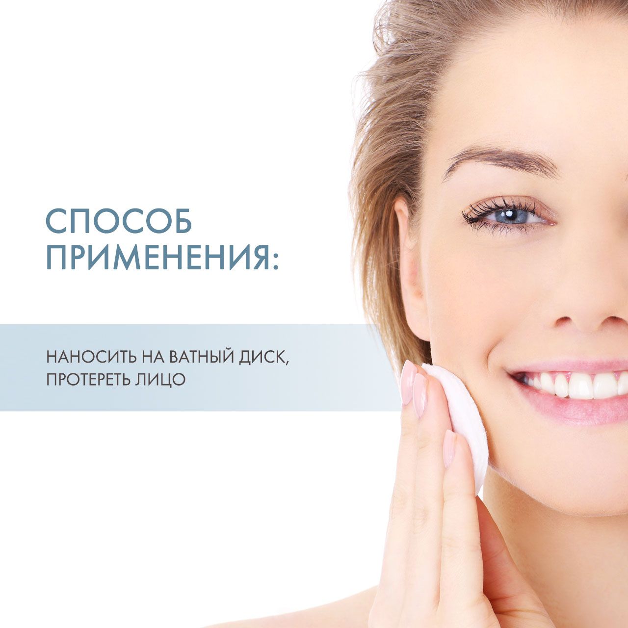 Нанесите лосьон на влажный диск. Легкими массажными движениями без нажима протрите кожу лица, шеи, декольте. Приступите к последующему уходу