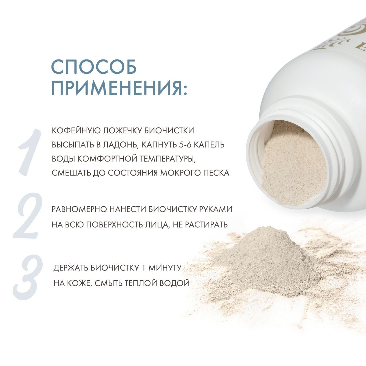 Для ежедневного умывания: снять макияж с век и ресниц с помощью «Очищающего молочка», лицо смочить водой, кофейную ложечку биочистки высыпать в ладонь, капнуть в ладонь 5-6 капель воды любой комфортной температуры, смешать до состояния мокрого песочка. равномерно нанести биочистку руками на всю поверхность лица, НЕ РАСТИРАТЬ(!), в местах, где есть черные точки или угревая сыпь можно слегка похлопать по коже подушечками пальцев. держать биочистку Нежную 20-30 секунд на коже смыть теплой водой. При регулярном использовании, когда кожа перестала быть сухой и стала нормальной, снизить время выдержки биочистки на лице до 15-20 секунд.