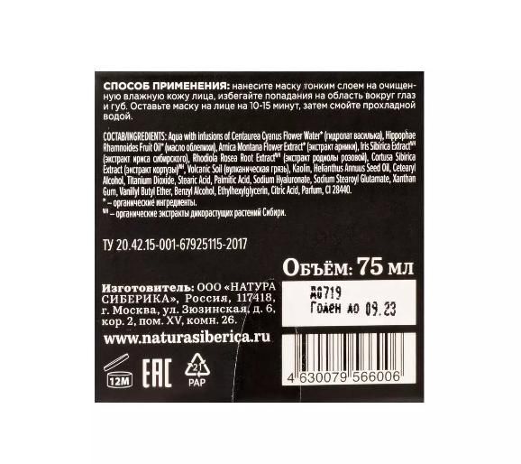 Состав: aqua with infusions of centaurea cyanus flower water* (гидролат василька), hippophae rhamnoides fruit oil* (масло облепихи), arnica montana flower extract* (экстракт арники), iris sibirica extract WH (экстракт ириса сибирского), rhodiola rosea root extract WH (экстракт родиолы розовой), cortusa sibirica extract (экстракт кортузы) WH, volcanic soil (вулканическая грязь), kaolin, helianthus annuus seed oil, cetearyl alcohol, titanium dioxide, stearic acid, palmitic acid, sodium hyaluronate, sodium stearoyl glutamate, xanthan gum, vanillyl butyl ether, benzyl alcohol, ethylhexylglycerin, citric acid, parfum, ci 28440