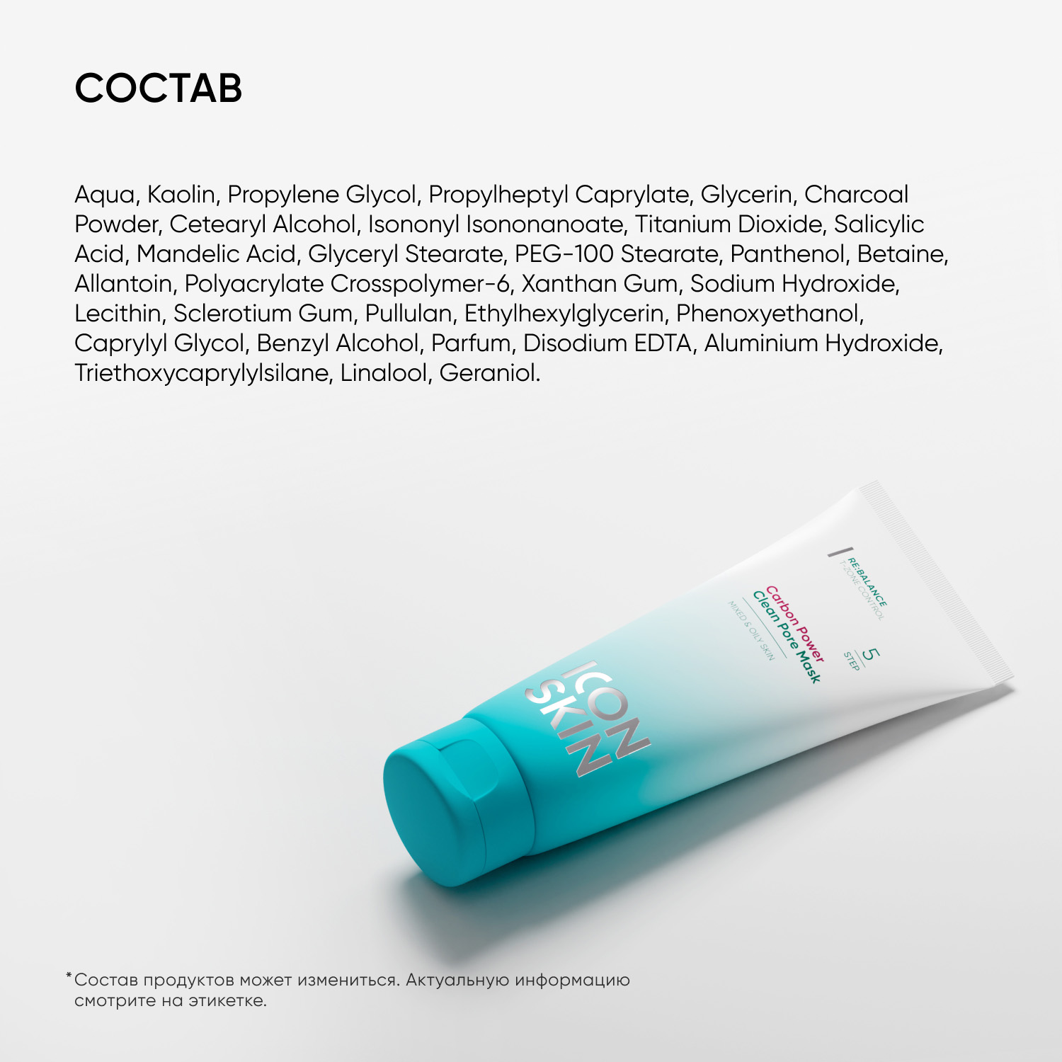 Состав: aqua, kaolin, propylene glycol, propylheptyl caprylate, glycerin, charcoal powder, cetearyl alcohol, isononyl isononanoate, titanium dioxide, salicylic acid, mandelic acid, glyceryl stearate, peg-100 stearate, panthenol, betaine, allantoin, polyacrylate crosspolymer-6, xanthan gum, sodium hydroxide, lecithin, sclerotium gum, pullulan, ethylhexylglycerin, phenoxyethanol, caprylyl glycol, benzyl alcohol, parfum, disodium edta, aluminium hydroxide, triethoxycaprylylsilane, linalool, geraniol.