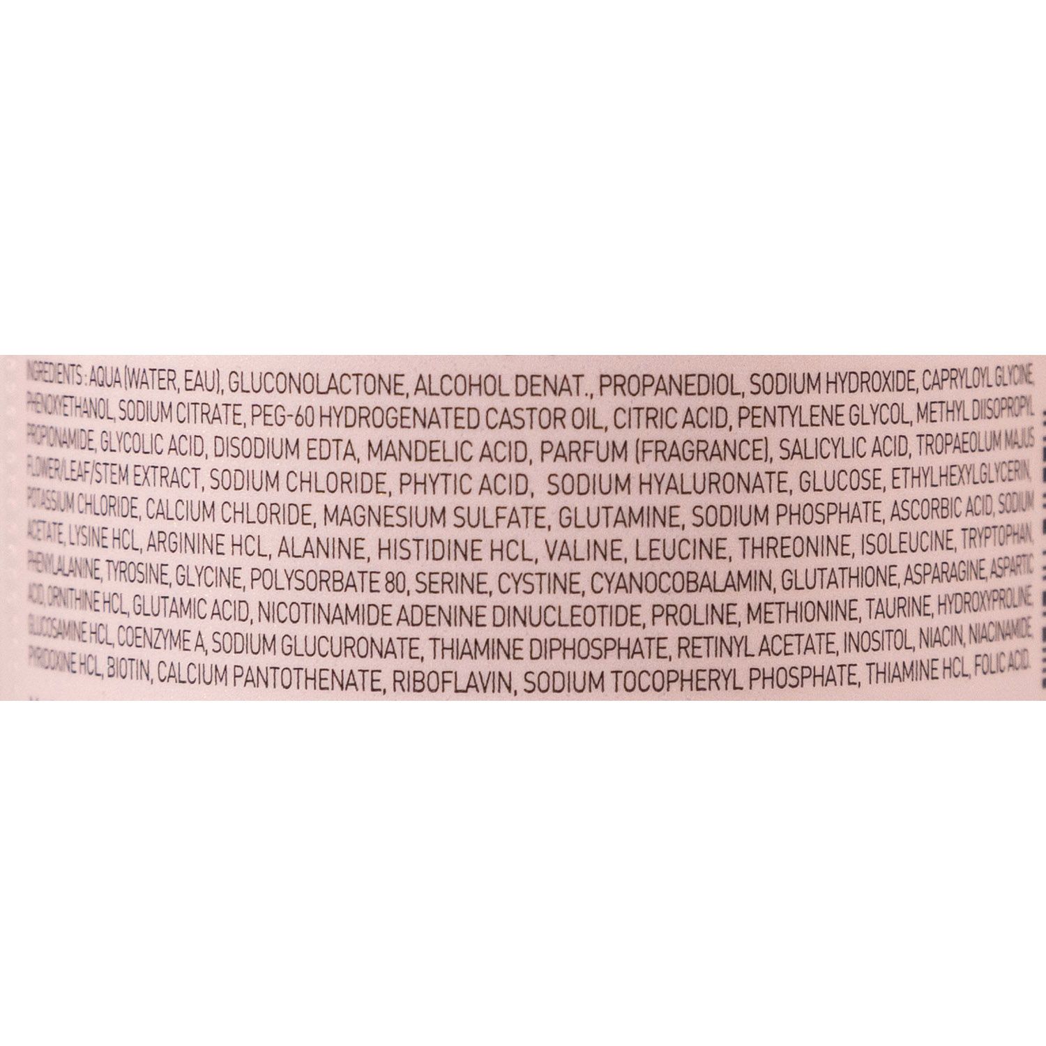 Состав: aqua (water, eau), gluconolactone, alcohol denat., propanediol, sodium hydroxide, capryloyl glycine, phenoxyethanol, sodium citrate, peg-60 hydrogenated castor oil, citric acid, pentylene glycol, methyl diisopropyl propionamide, glycolic acid, disodium edta, mandelic acid, parfum (fragrance), salicylic acid, tropaeolum majus flower/leaf/stem extract, sodium chloride, phytic acid, sodium hyaluronate, glucose, ethylhexylglycerin, potassium chloride, calcium chloride, magnesium sulfate, glutamine, sodium phosphate, ascorbic acid, sodium acetate, lysine hcl, arginine hcl, alanine, histidine hcl, valine, leucine, threonine, isoleucine, tryptophan, phenylalanine, tyrosine, glycine, polysorbate 80, serine, cystine, cyanocobalamin, glutathione, asparagine, aspartic acid, ornithine hcl, glutamic acid, nicotinamide adenine dinucleotide, proline, methionine, taurine, hydroxyproline, glucosamine hcl, coenzyme a, sodium glucuronate, thiamine diphosphate, retinyl acetate, inositol, niacin, niacinamide, pyridoxine hcl, biotin, calcium pantothenate, riboflavin, sodium tocopheryl phosphate, thiamine hcl, folic acid