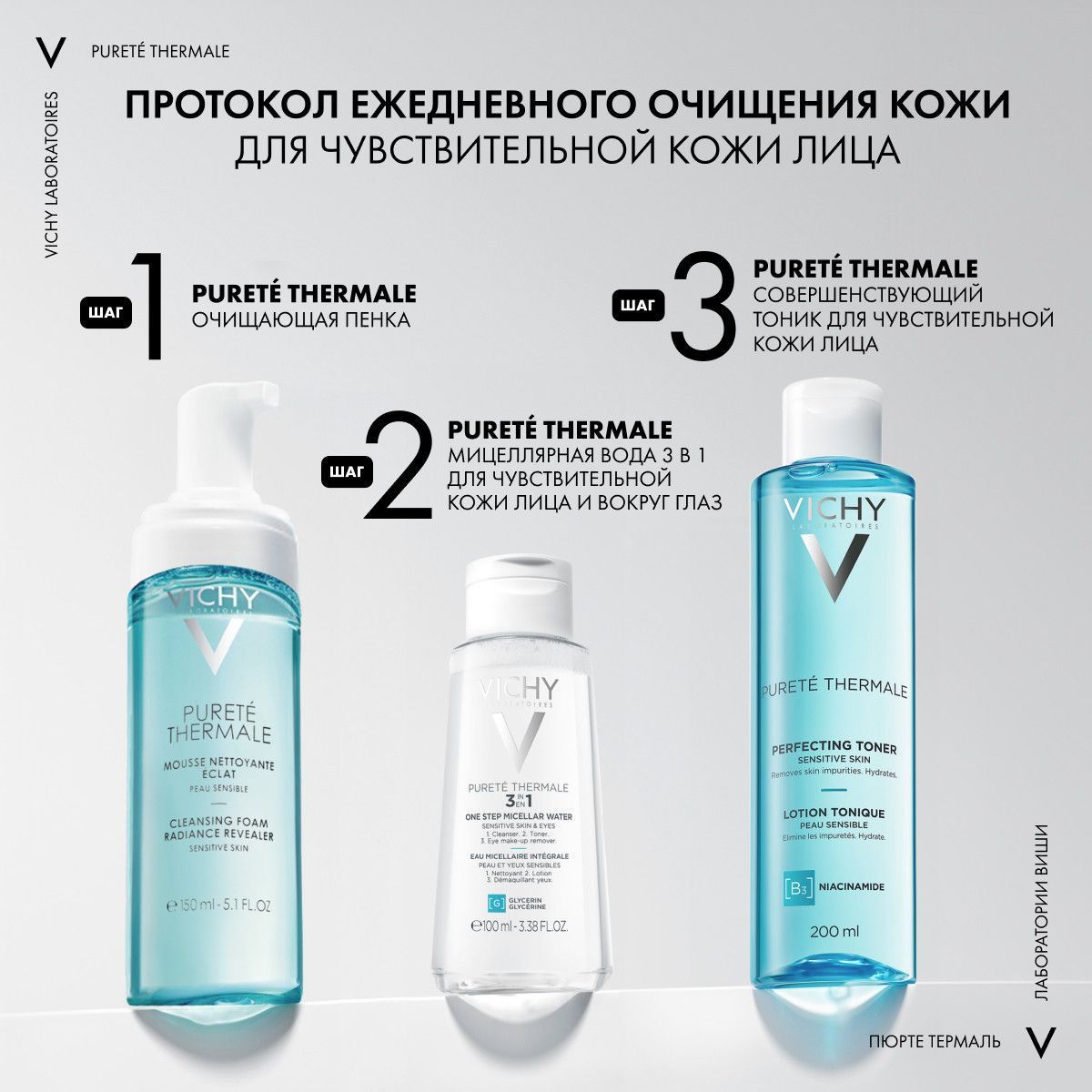 Не требует смывания. Тоник можно использовать после очищающих средств гаммы Purete Thermale.