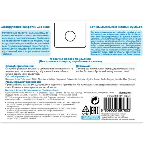 Матирующие салфетки предназначены для моментального удаления излишков жира с поверхности кожи лица. Простой и быстрый способ очищения лица и придания ей свежести. На салфетки нанесен специальный тальк, который моментально впитывает излишки жира, не нарушая макияжа. Таким образом, вам не надо постоянно пудрить лицо для удаления неприятного блеска, что ведет к накоплению слоев пудры и к закупориванию пор. Использование матирующих салфеток придает вашей коже свежий и ухоженный вид, а поры остаются чистыми.