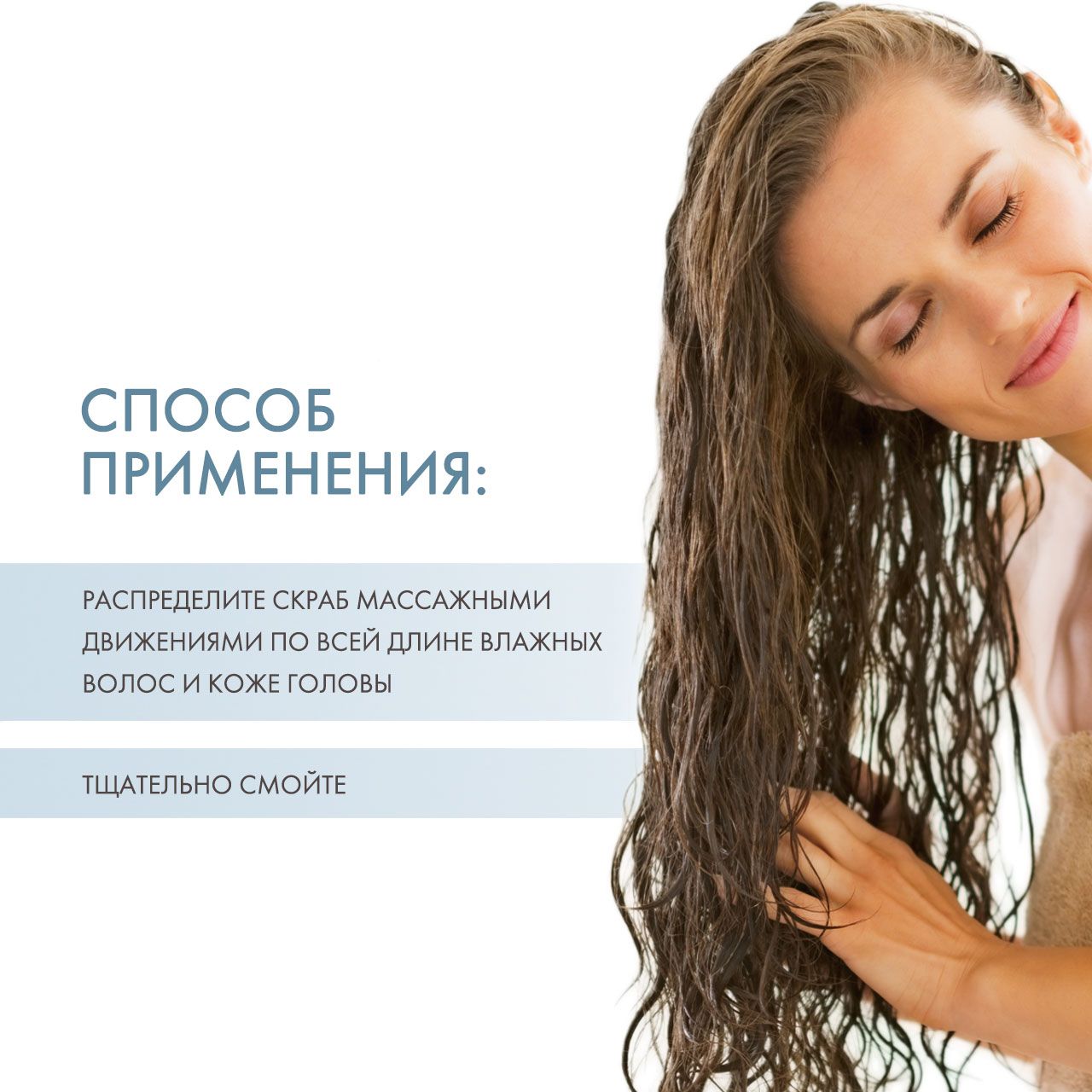 Распределите скраб массажными движениями по всей длине влажных волос и коже головы. Тщательно смойте.