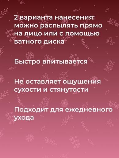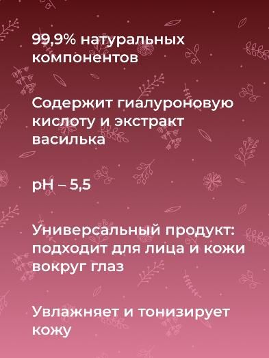 Состав: вода дистиллированная (aqua), гидролат розы (rosa gallica flower water), гидролат василька (centaurea cyanus l. flower water), глицерин (glycerin), полиглицерил-10 лаурат* (polyglyceryl-10 laurate), бензиловый спирт (benzyl alcohol), пентилен гликоль** (pentelene glycol), д-пантенол (panthenol), этилгексилглицерин (еthylhexylglycerin), витамин е (tocopherol), гиалуроновая кислота (sodium hyaluronate), экстракт женьшеня (panax ginseng root еxtract), экстракт малины (rubur idaeus extract), экстракт яблока (mains domestica borkh extract), экстракт винограда (vitis vinifera extract), экстракт граната (hunica granatum extract), экстракт калины (viburnum opulus extract), эфирное масло гвоздики (eugenia caryophyllata essential oil)