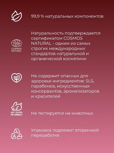 Создано из природных компонентов высокого качества. Не содержит SLS, парабенов, искусственных консервантов, ароматизаторов и красителей.
