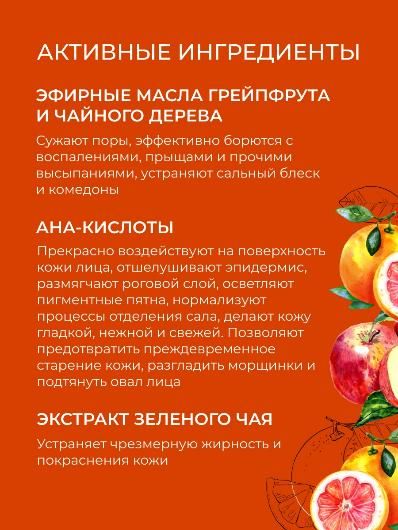 Состав: вода дистиллированная (aqua), полиглицерил-10 лаурат* (polyglyceryl-10 laurate), бензиловый спирт (benzyl alcohol), пентилен гликоль** (pentelene glycol), яблочная кислота (мalic acid), гликолевая кислота (glycolic acid), д-пантенол (panthenol), молочная кислота (lactic acid), этилгексилглицерин (еthylhexylglycerin), эфирное масло грейпфрута (citrus paradisi essential oil), эфирное масло чайного дерева (melaleuca alternifolia (tea tree) leaf essential oil), эфирное масло шалфея (salvia officinalis essential oil), экстракт зеленого чая (camellia sinensis extract), витамин с (l-ascorbic acid)