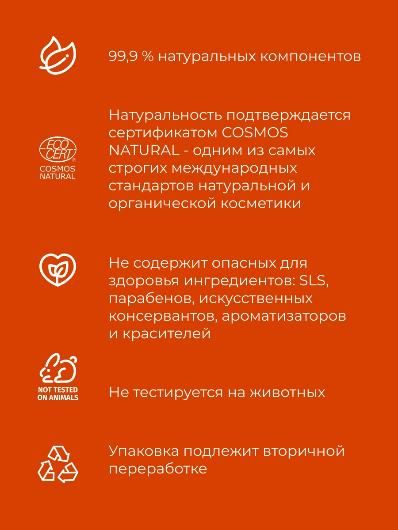 Создано из природных компонентов высокого качества. Не содержит SLS, парабенов, искусственных консервантов, ароматизаторов и красителей.
