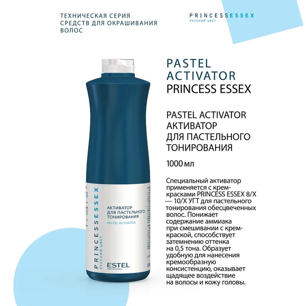 Применяется с крем-красками Princess Essex 8–10-го уровней тона для пастельного тонирования обесцвеченных волос. Понижает содержание аммиака при смешивании с крем-краской. Образует удобную для нанесения кремообразную консистенцию, оказывает щадящее воздействие на волосы и кожу головы.