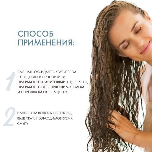 При смешивании с красителями и осветляющими средствами образует однородную смесь, которая не стекает при нанесении на волосы. Мощность осветления зависит от «холодной» / «теплой» зоны, текстуры волос, типа красителя и времени выдержки продукта.
