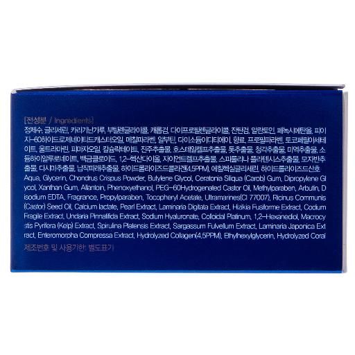 Aqua, chondrus crispus powder, butylene gycol, ceratonia siliqua gum, dipropylene glycol, xantan gum, allantoin, phenoxyethanol, PEG-60 hydrogenated castor oil, methylparaben, arbutin, disodum edta,fragrance, propylparaben, tocopheryl acetate, utramarines (CI 77007), ricinus communis (castor) seed oil, calcium lactate, pearl extract, laminaria digitata extract, hizikia fusiforme extract, codium fragile extact, sodium hyaluronate, colloidal platinum, 1.2-hexanediol,macrocystis kelp extract, spirulina extract, sargassum fulwellum extract, laminaria japonica extract, enteromopha compressa extract, hydrolyzed collagen, ethylhexylglycerin, hydrolyzed coral.