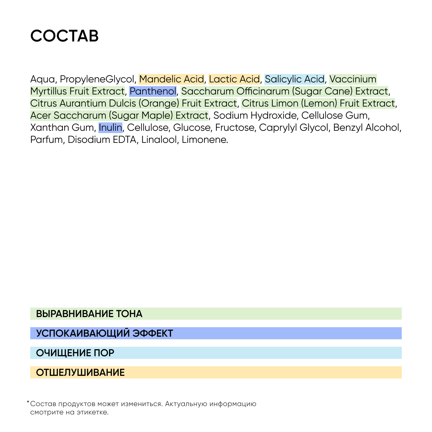 Состав: aqua, propylene glycol, mandelic acid, lactic acid, salicylic acid, vaccinium myrtillus fruit extract, panthenol, saccharum officinarum (sugar cane) extract, citrus aurantium dulcis (orange) fruit extract, citrus limon (lemon) fruit extract, acer saccharum (sugar maple) extract, sodium hydroxide, cellulose gum, xanthan gum, inulin, cellulose, glucose, fructose, caprylyl glycol, benzyl alcohol, parfum, disodium edta, linalool, limonene.