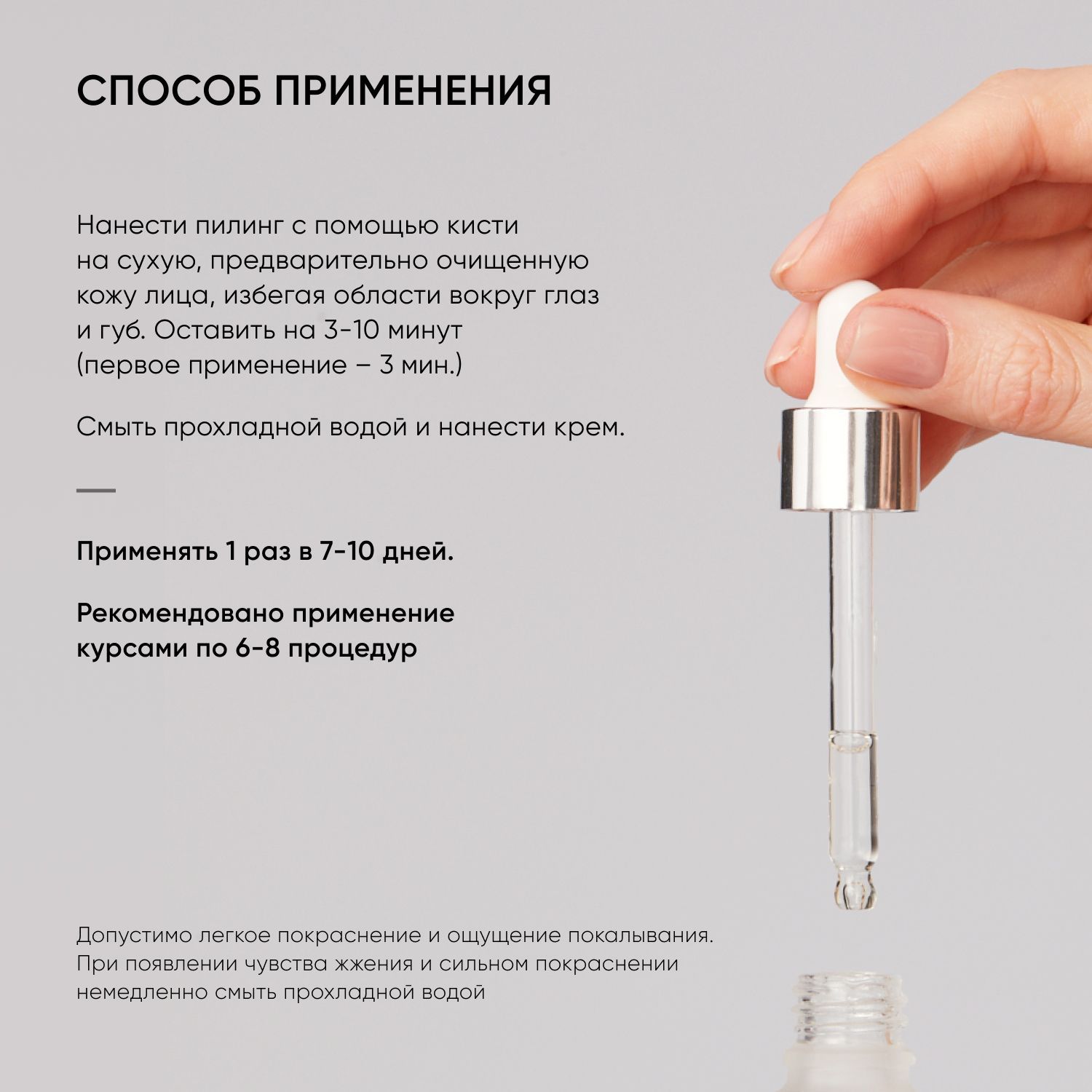 Применять 1 раз в 7–10 дней. В процессе экспозиции пилинга возможно легкое покраснение и ощущение покалывания. При появлении чувства жжения и сильном покраснении смыть средство прохладной водой.