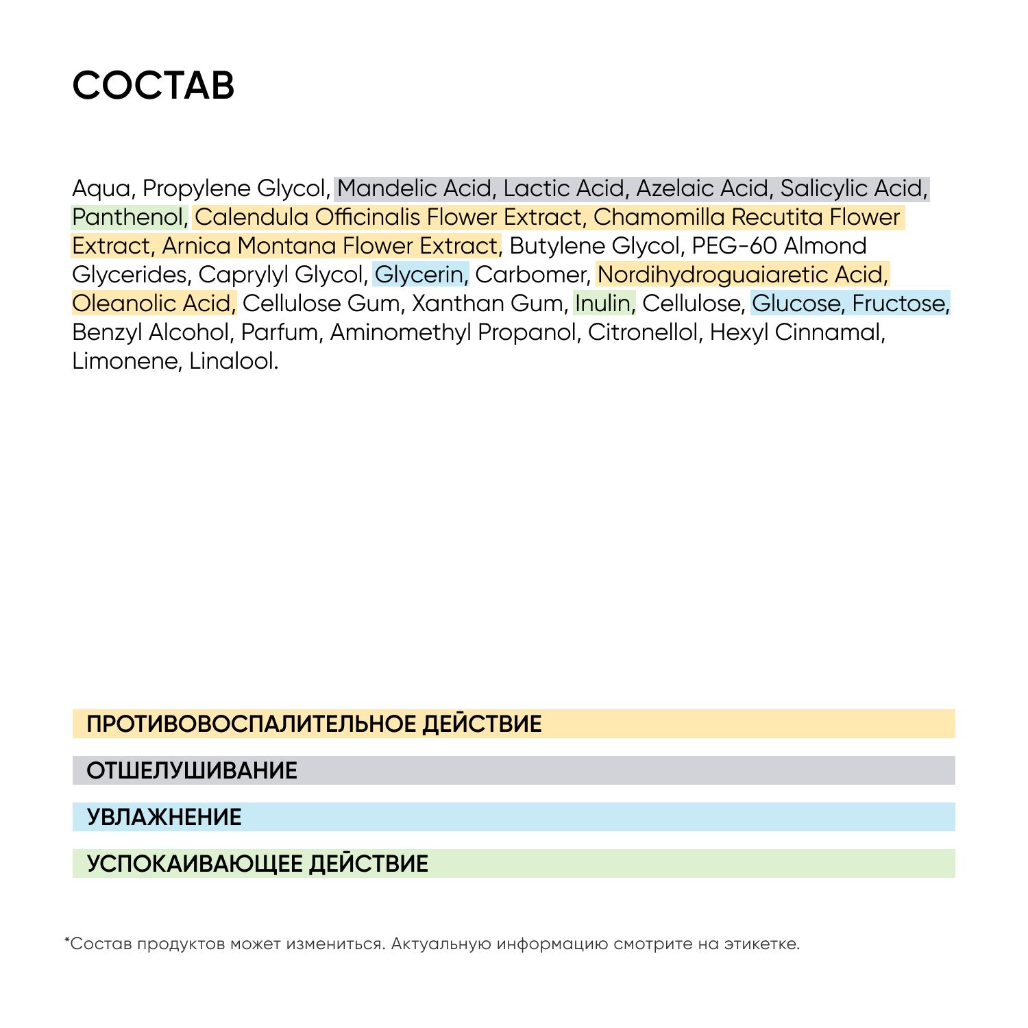 Состав: aqua, propylene glycol, mandelic acid, lactic acid, azelaic acid, salicylic acid, butylene glycol, peg-60 almond glycerides, caprylyl glycol, glycerin, carbomer, nordihydroguaiaretic acid, oleanolic acid, panthenol, calendula officinalis flower extract, chamomilla recutita flower extract, arnica montana flower extract, cellulose gum, xanthan gum, inulin, cellulose, glucose, fructose, benzyl alcohol, parfum, aminomethyl propanol