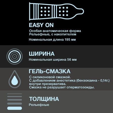 Презервативы из натурального латекса с силиконовой смазкой с добавлением анестетика (бензокаина).