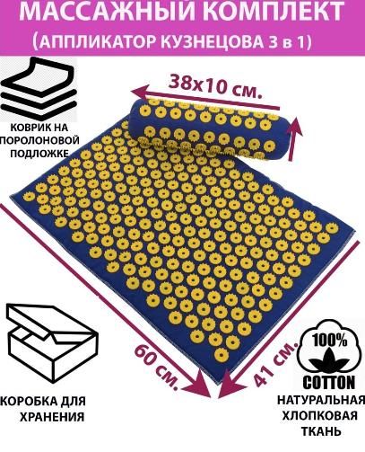 В массажный набор входят коврик 41х60 см и валик 38х10 см. Игольчатые модули припаиваются по бесклеевой технологии, без применения клея, что значительно усиливает их крепление.