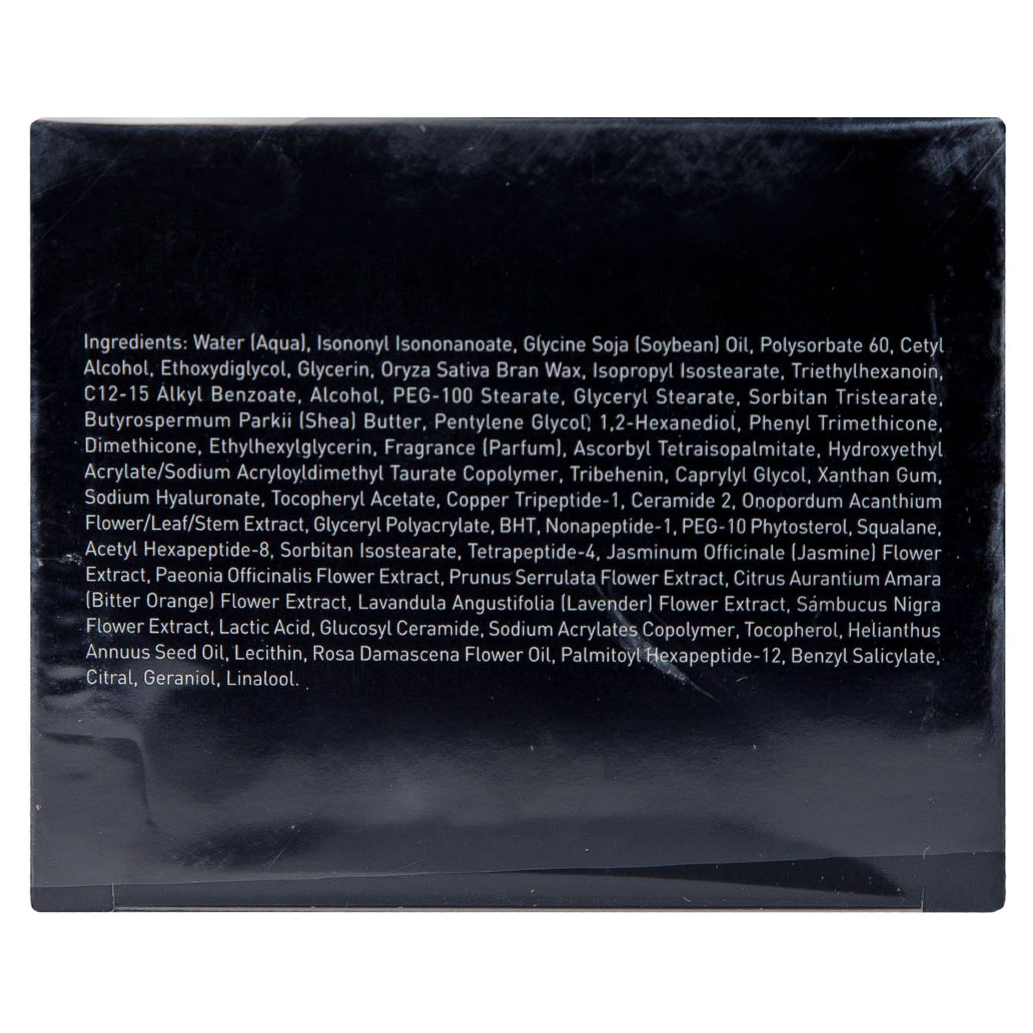 Состав: water (aqua), isononyl isononanoate, glycine soja (soybean) oil, polysorbate 60, cetyl alcohol, ethoxydiglycol, glycerin, oryza sativa bran wax, isopropyl isostearate, triethylhexanoin. c12-15 alkyl benzoate, alcohol, peg-100 stearate, glyceryl stearate, sorbitan tristearate, butyrospermum parkii (shea butter), pentylene glycol, 1,2-hexanediol, phenyl trimethicone, dimethicone, ethylhexylglycerin, fragrance (parfum), ascorbyl tetraisopalmitate, hydroxyethyl acrylate/sodium acryloyldimethyl taurate copolymer, tribehenin, caprylyl glycol, xanthan gum, sodium hyaluronate, tocopheryl acetate, copper tripeptide-1, ceramide 2, onopordum acanthium flower/leaf/stem extract, glyceryl polyacrylate, bht, nonapeptide-1, peg-10 phytosterol, squalane, acetyl hexapeptide-8, sorbitan isostearate, tetrapeptide-4, jasminum officinale (jasminel flower) extract, paeonia officinalis flower extract, prunus serrulata flower extract, citrus aurantium amara (bitter orange) flower extract, lavandula angustifolia (lavender) flower extract, sambucus nigra flower extract, lactic acid, glucosyl ceramide, sodium acrylates copolymer, tocopherol, helianthus annuus seed oil, lecithin, rosa damascena flower oil, palmitoyl hexapeptide-12, benzyl salicylate, citral, geraniol, linalool