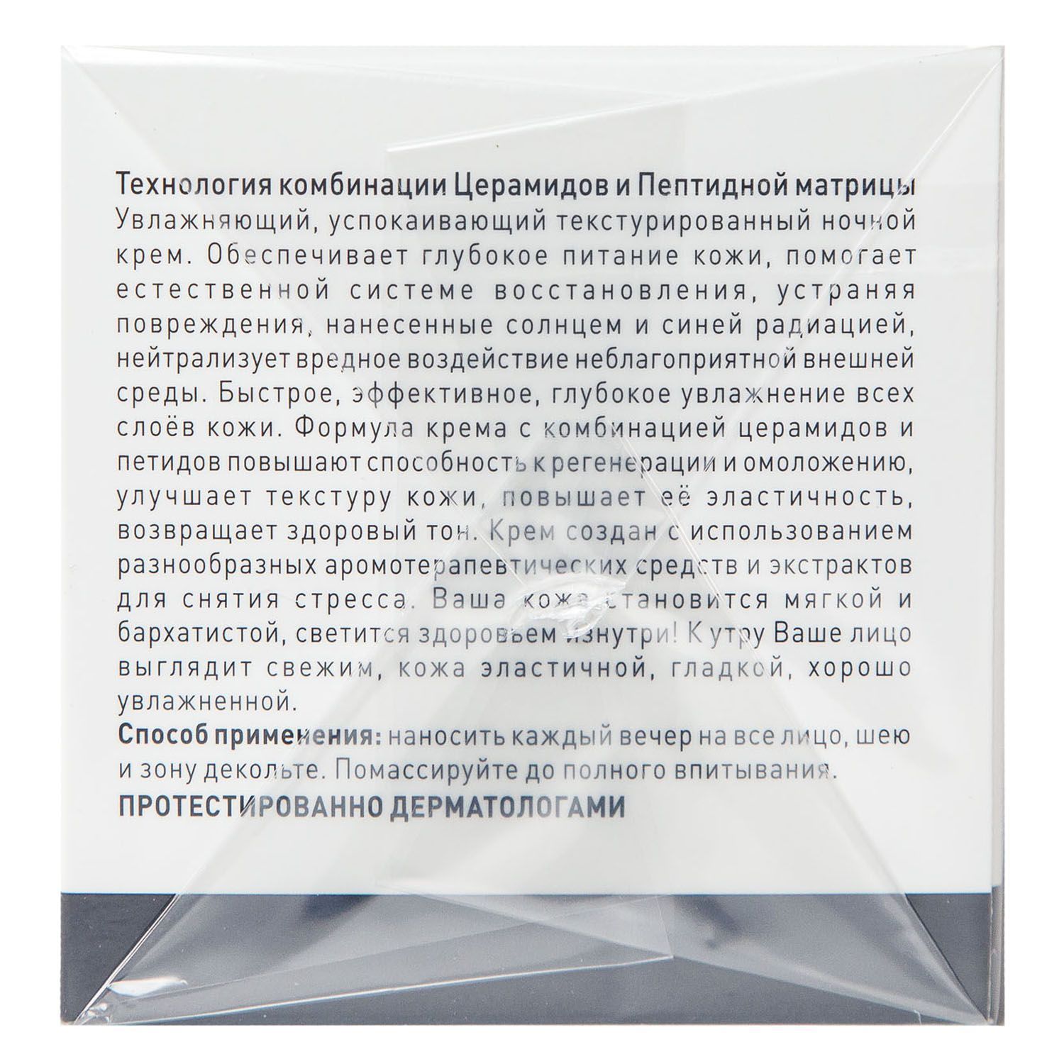 Легкими массажными движениями нанесите крем на очищенную тонизированную кожу. Применяйте вечером или за 15-20 минут перед сном