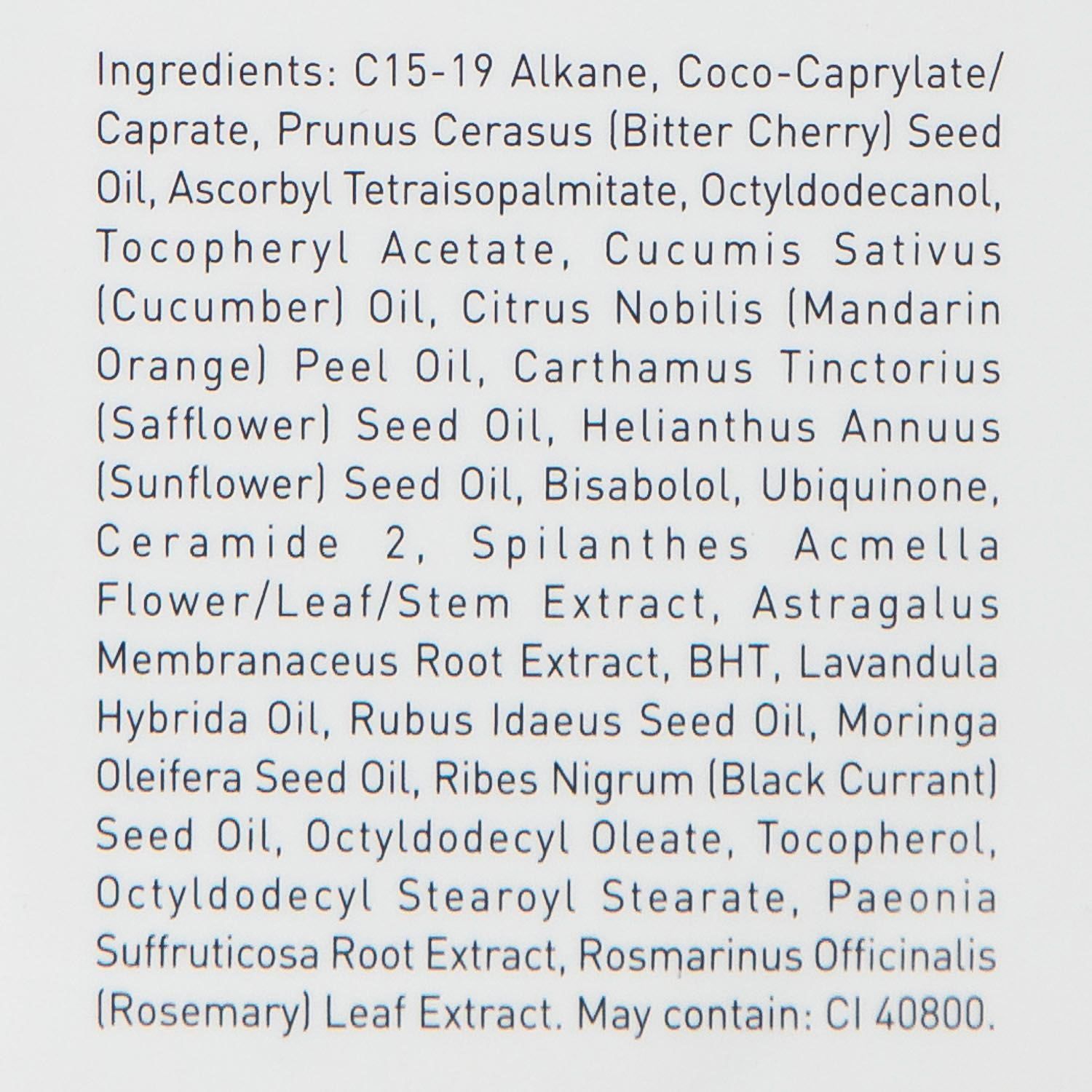 Состав: c15-19 alkane, coco-caprylate caprate, prunus cerasus (bitter cherry) seed oil, ascorbyl tetraisopalmitate, octyldodecanol, tocopheryl acetate, cucumis sativus (cucumber) oil, citrus nobilis (mandarin orange) peel oil, carthamus tinctorius (safflower) seed oil, helianthus annuus (sunflower) seed oil, bisabolol, ubiquinone, ceramide 2, spilanthes acmella flower/leaf/stem extract, astragalus membranaceus root extract, bht, lavandula hybrida oil, rubus idaeus seed oil, moringa oleifera seed oil, ribes nigrum (black currant) seed oil, octyldodecyl oleate, tocopherol, octyldodecyl stearoyl stearate, paeonia suffruticosa root extract, rosmarinus officinalis (rosemary) leaf extract. may contain: cl 40800