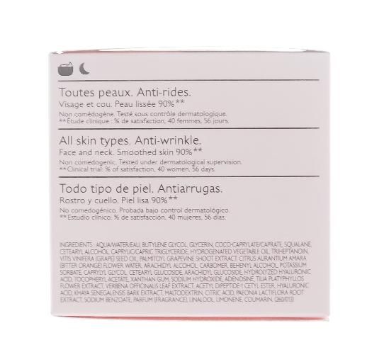 Aqua/water/eau, butylene glycol, glycerin, coco-caprylate/caprate, squalane, cetearyl alcohol, caprylic/capric triglyceride, hydrogenated vegetable oil, triheptanoin, vitis vinifera (grape) seed oil, palmitoyl grapevine shoot extract, citrus aurantium amara (bitter orange) flower water, arachidyl alcohol, carbomer, behenyl alcohol, potassium sorbate, caprylyl glycol, cetearyl glucoside, arachidyl glucoside, hydrolyzed hyaluronic acid, tocopheryl acetate, xanthan gum, sodium hydroxide, adenosine, tilia platyphyllos flower extract, verbena officinalis leaf extract, acetyl dipeptide-1 cetyl ester, hyaluronic acid, khaya senegalensis bark extract, maltodextrin, citric acid, paeonia lactiflora root extract, sodium benzoate, parfum (fragrance), linalool, limonene, coumarin