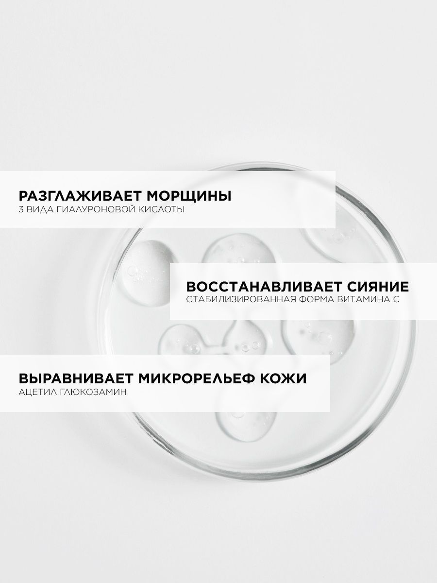 Активы: сочетание 3-х видов гиалуроновой кислоты высокой чистоты 90,1% высокомолекулярная, 0,1% низкомолекулярная, 0,1% пролонгированного действия), стабилизированные витамины С 2% и Е 0,1%, Витамин РР 2% и дипептид 0,2%.