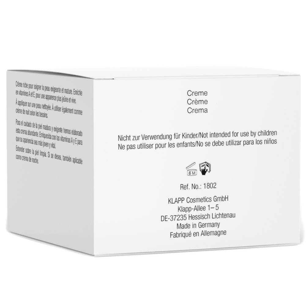 Насыщенный питательный продукт с наполняющим, разглаживающим, осветляющим действием для зрелой сухой кожи с признаками фотостарения. Мгновенно избавляет от сухости, делает кожу гладкой и бархатистой. При курсовом применении повышает упругость кожи, уменьшает выраженность возрастных изменений.