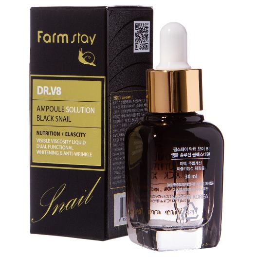 Ампульная сыворотка Farm Stay R-V8 Ampoule SoluTion Black Snail с муцином черной улитки и экстрактом икры обеспечивает регенерацию, борьбу со старением, защиту, увлажнение и питание. Сыворотка Farm Stay R-V8 Ampoule SoluTion Black Snail не только удаляет морщинки, но и повышает упругость и эластичность кожи. Выравнивает тон кожи, осветляет пигментацию и постакне. Подходит даже для чувствительной кожи, защищает ее от раздражений.