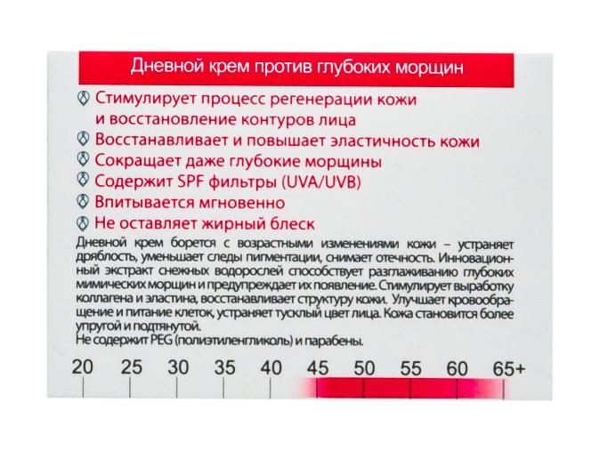 Нанесите крем утром на очищенную кожу лица легкими массажными движениями. Избегайте область вокруг глаз. Вечером используйте Ночной крем против глубоких морщин.