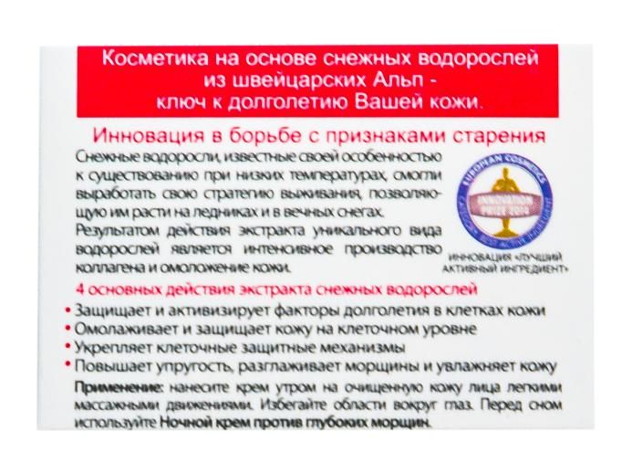Инновация в борьбе с признаками старения. Снежные водоросли, известные своей особенностью к существованию при низких температурах, смогли выработать свою стратегию выживания, позволяющую им расти на ледниках и в вечных снегах. Результатом действия экстракта уникального вида водорослей является интенсивное производство коллагена и омоложение кожи. Кожный барьер усиливается, кожа становится более свежей, детоксифицированной, менее заметны возрастные пятна.