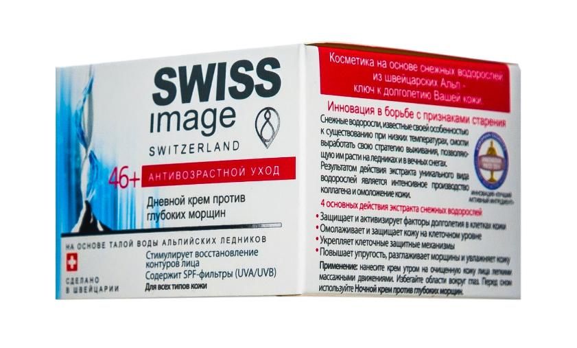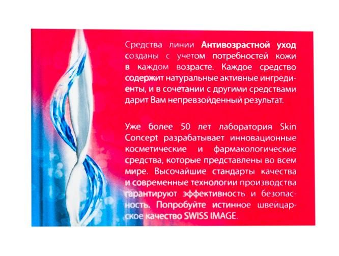 Специально с учетом потребностей кожи швейцарская лаборатория Skin Concept разработала новую марку косметики SWISS IMAGE, которая производится из натуральных биологически активных ингредиентов. Средство стимулирует процесс регенерации кожи и восстановление контуров лица. Инновационный экстракт снежных водорослей способствует разглаживанию глубоких мимических морщин и предупреждает их появление. Стимулирует выработку коллагена и эластина, восстанавливает структуру кожи. Улучшает кровообращение и питание клеток, устраняет тусклый цвет лица. Кожа становится более упругой и подтянутой. Экстракт коры африканской березы нейтрализует действие свободных радикалов и защищает кожу. Натуральный комплекс, содержащийся в креме, существенно повышает уровень влаги в коже и обеспечивает оптимальный уровень питания и увлажнения на 24 часа. Легкая текстура крема быстро впитывается и не оставляет жирных следов на коже. Содержатся SPF фильтры (UVA/UVB). Не содержит PEG (полиэтиленгликоль) и парабенов.