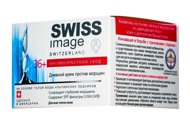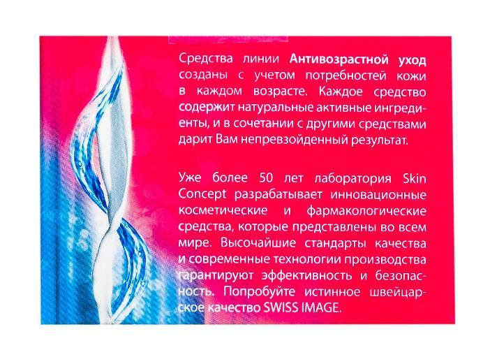 Специально с учетом потребностей кожи швейцарская лаборатория Skin Concept разработала новую марку косметики SWISS IMAGE, которая производится из натуральных биологически активных ингредиентов. Средство борется с возрастными изменениями кожи – сокращает глубокие морщины, устраняет дряблость, уменьшает следы пигментации, снимает отечность. Инновационный экстракт снежных водорослей способствует разглаживанию морщин и предупреждает их появление. Стимулирует выработку коллагена и эластина, восстанавливает их структуру. Усиливает кровообращение и питание клеток кожи, устраняет тусклый цвет лица. Кожа становится более упругой и подтянутой, корректирует овал лица. Экстракт коры африканской березы нейтрализует действие свободных радикалов и защищает кожу. Натуральный комплекс, содержащийся в креме, существенно повышает уровень влаги в коже и обеспечивает оптимальный уровень питания и увлажнения на 24 часа. Содержатся SPF фильтры (UVA/UVB). Не содержит PEG (полиэтиленгликоль) и парабенов.