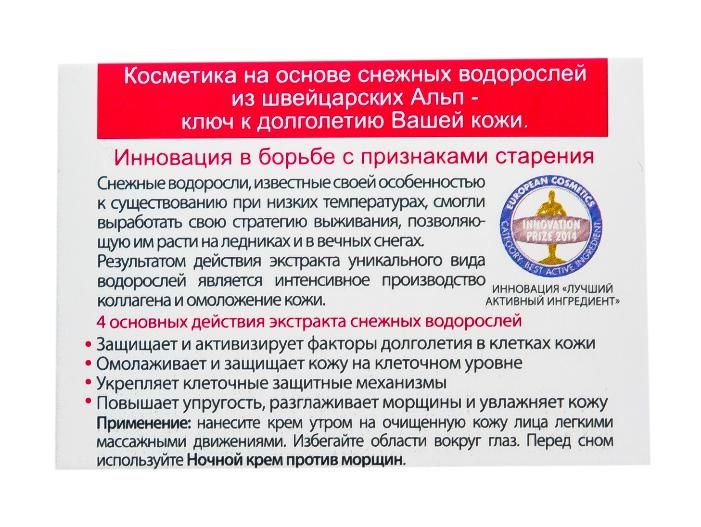 Инновация в борьбе с признаками старения. Снежные водоросли, известные своей особенностью к существованию при низких температурах, смогли выработать свою стратегию выживания, позволяющую им расти на ледниках и в вечных снегах. Результатом действия экстракта уникального вида водорослей является интенсивное производство коллагена и омоложение кожи. Кожный барьер усиливается, кожа становится более свежей, детоксифицированной, менее заметны возрастные пятна.