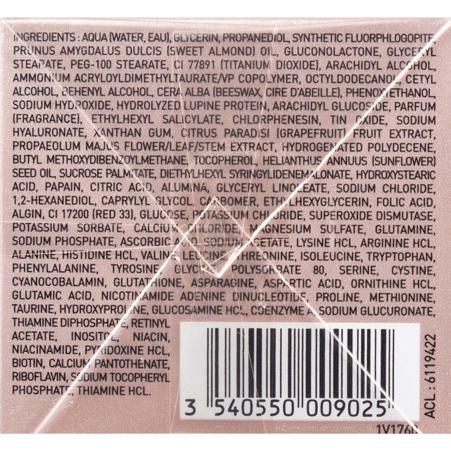 Состав: aqua (water, eau), glycerin, propanediol, synthetic fluorphlogopite, prunus amygdalus dulcis (sweet almond) oil, gluconolactone, glyceryl stearate, peg-100 stearate, ci 77891 (titanium dioxide), arachidyl alcohol, ammonium acryloyldimethyltaurate/vp copolymer, octyldodecanol, cetyl alcohol, behenyl alcohol, cera alba (beeswax, cire d’abeille), phenoxyethanol, sodium hydroxide, hydrolyzed lupine protein, arachidyl glucoside, parfum (fragrance), ethylhexyl salicylate, chlorphenesin, tin oxide, sodium hyaluronate, xanthan gum, citrus paradisi (grapefruit) fruit extract, propaeolum majus flower/leaf/stem extract, hydrogenated polydecene, butyl methoxydibenzoylmethane, tocopherol, helianthus annuus (sunflower) seed oil, sucrose palmitate, diethylhexyl syringylidenemalonate, hydroxystearic acid, papain, citric acid, alumina, glyceryl linoleate, sodium chloride, 1,2-hexanediol, caprylyl glycol, carbomer, ethylhexyglycerin, folic acid, algin, ci 17200 (red 33), glucose, potassium chloride, superoxide dismutase, potassium sorbate, calcium chloride, magnesium sulfate, glutamine, sodium phosphate, ascorbic acid, sodium acetate, lysine hcl, arginine hcl, alanine, histidine hcl, valine, leucine, threonine, isoleucine, tryptophan, phenylalanine, tyrosine, glycine, polysorbate 80, serine, cystine, cyanocobalamin, glutathione, asparagine, aspartic acid, ornithine hcl, glutamic acid, nicotinamide adenine dinucleotide, proline, methionine, taurine, hydroxyproline, glucosamine hcl, coenzyme a, sodium glucuronate, thiamine diphosphate, retinyl acetate, inositol, niacin, niacinamide, pyridoxine hcl, biotin, calcium pantothenate, riboflavin, sodium tocopheryl phosphate, thiamine hcl.