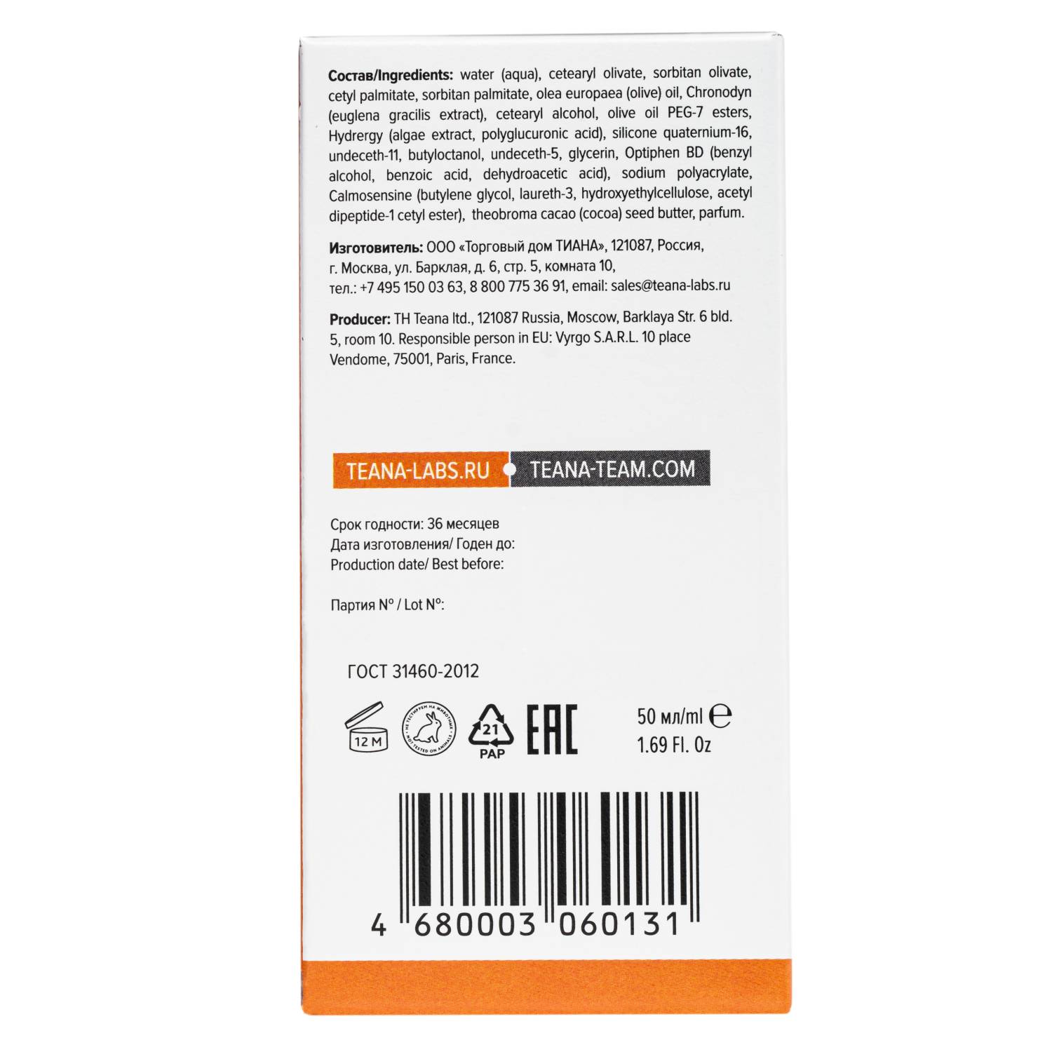 Вода, Цетеарил оливат, Сорбитан оливат, Цетил пальмитат, Сорбитан пальмитат, Chronodyn (экстракт зеленой водоросли Euglena gracilis, Глицерин), Масло оливковое, Моностеарат глицерина, Изооктил стеарат, Цетеарил этилгексаноат, ПЭГ-7 эфиры оливкового масла, Цетилстеариловый спирт, Hydrergy (Вода, Глицерин, Экстракт микроводоросли, Полиглюкуроновая кислота), Диметикон, Глицерин, Calmosensine (бутиленгликоль, Вода, Лаурет-3, Гидроксиэтилглюкоза, Ацетил дипептид-1 цетиловый эфир), Масло какао, Акрилаты/С 10-30 алкил акрилат кроссполимер, Триэтаноламин, Оптифен, Парфюмерная композиция.