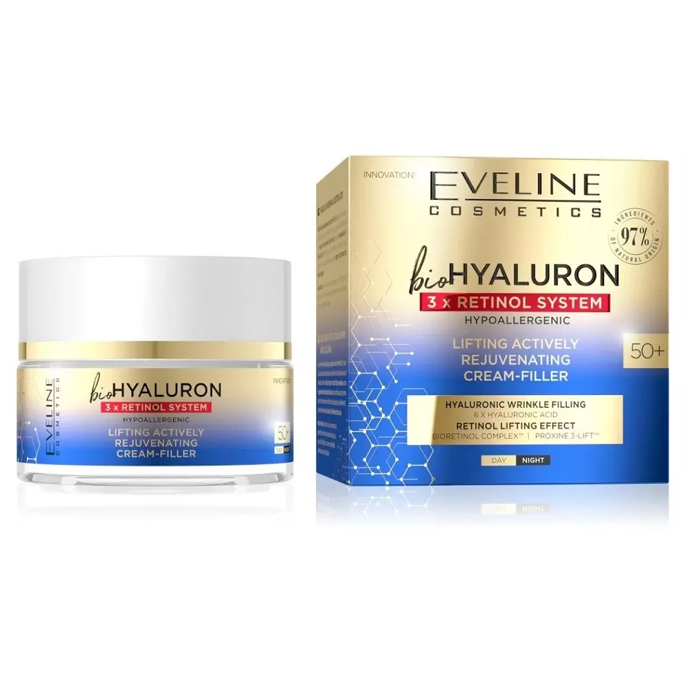 Крем для лица Eveline Cosmetics Bio Hyaluron 3x Retinol System обеспечивает эффективный ежедневный уход за возрастной кожей 50+: