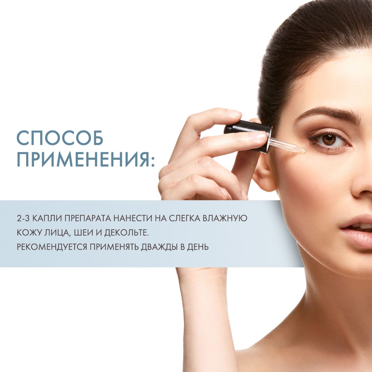2-3 капли препарата нанести на слегка влажную кожу лица, шеи и декольте. Рекомендуется применять дважды в день, затем наносить дневной или ночной крем в соответствии с типом кожи.