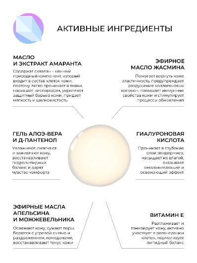 Состав: вода дистиллированная (aqua), масло амаранта (amaranthus cruentus seed oil), гель алоэ-вера (aloe barbadensis leaf juice), глицерил цитрат/лактат/линолеат/олеат (gliceril citrate/lactate/linoleate/oleate), глицерин (glycerin), бензиловый спирт (benzyl alcohol), экстракт амаранта (amaranthus cruentus extract), гиалуроновая кислота (sodium hyaluronate), д-пантенол (panthenol), ксантановая камедь (xanthan gum), эфирное масло жасмина (jasminum grandiflorum essential oil), витамин е (tocopherol), эфирное масло апельсина (citrus aurantium essential oil), эфирное масло можжевельника (juniperus communis essential oil), этилгексилглицерин (ethylhexylglycerin)