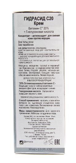 Гидрасид С20 - это антиоксидантный уход с максимально возможной концентрацией оптимизированного витамина С. Гиалуроновая кислота высокого молекулярного веса увлажняет и наполняет кожу. Обеспечивает сияющий, ровный тон кожи, разглаживает морщины и морщинки, возвращает плотность и объем. Устраняет последствия вредных внешних воздействий, стресса, усталости.
