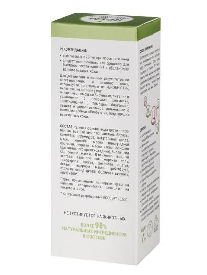 Состав: гелевая основа, вода дистиллированная, водный экстракт листьев березы, комплекс церамидов, питательная среда, масло жожоба, масло виноградной косточки, лецитин, масло какао, ланолин (растительного происхождения), биопептид CL, соевое масло, Д-пантенол, водный экстракт зеленого чая, морская соль, токоферола ацетат, ретинола ацетат, бетаин, эфирное масло грейпфрута, отдушка, оксид цинка, фолиевая кислота, Euxyl K900.