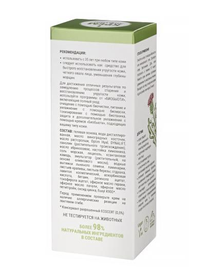 Состав: гелевая основа, вода дистиллированная, масло виноградных косточек, масло расторопши, optim hyal, dynalift, ланолин (растительного происхождения), масло абрикосовое, настойка лимонника, соль морская, лецигель, ксантановая камедь, эмульгатор, водные вытяжки льняного семени, ламинарии, листьев крапивы, листьев березы; отдушка, лавитол косметический, аскорбиновая кислота, бетаин, ретинола ацетат, токоферола ацетат, эфирное масло герани, эфирное масло пачули, эфирное масло петитгрэйн, оксид цинка, консервант euxyl k900 (ecocert)