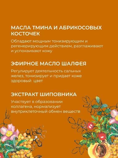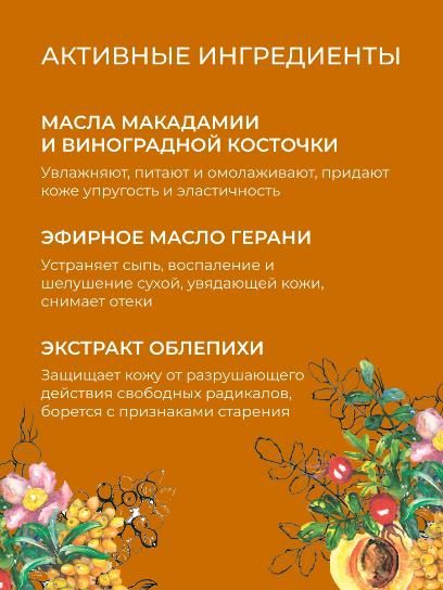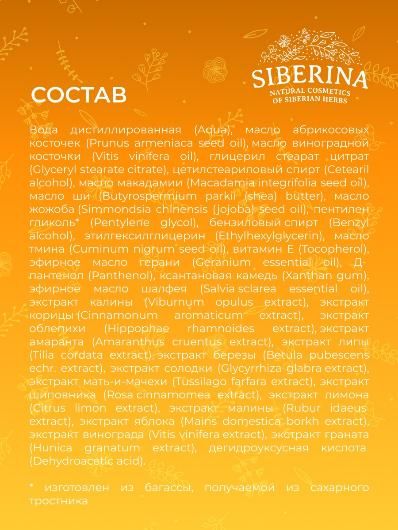 Состав: вода дистиллированная (aqua), масло абрикосовых косточек (prunus armeniaca seed oil), масло виноградной косточки (vitis vinifera oil), глицерил стеарат цитрат (glyceryl stearate citrate), цетилстеариловый спирт (cetearil alcohol), масло макадамии (macadamia integrifolia seed оil), масло ши (вutyrospermium parkii (shea) butter), масло жожоба (simmondsia chinensis (jojoba) seed oil), пентилен гликоль (pentylene glycol), бензиловый спирт (benzyl alcohol), этилгексилглицерин (ethylhexylglycerin), масло тмина (сuminum nigrum seed оil), витамин е (tocopherol), эфирное масло герани (geranium essential oil), д-пантенол (panthenol), ксантановая камедь (xanthan gum), эфирное масло шалфея (salvia sclarea essential oil), экстракт калины (viburnum opulus extract), экстракт корицы (cinnamonum aromaticum extract), экстракт облепихи (hippophae rhamnoides extract), экстракт амаранта (amaranthus cruentus extract), экстракт липы (tilia cordata extract), экстракт берёзы (betula pubescens echr. extract), экстракт солодки (glycyrrhiza glabra extract), экстракт мать-и-мачехи (tussilago farfara extract), экстракт шиповника (rosa cinnamomea extract), экстракт лимона (citrus limon extract), экстракт малины (rubur idaeus extract), экстракт яблока (mains domestica borkh extract), экстракт винограда (vitis vinifera extract), экстракт граната (hunica granatum extract), дегидроуксусная кислота (dehydroacetic acid)