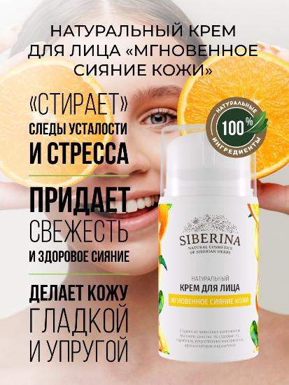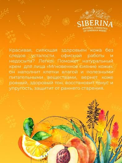 Крем для лица "Мгновенное сияние кожи" с легкой текстурой эффективно увлажняет, питает и восстанавливает кожу. Сочетание полезных ингредиентов придает коже упругость, матовость и замедляет процесс старения.