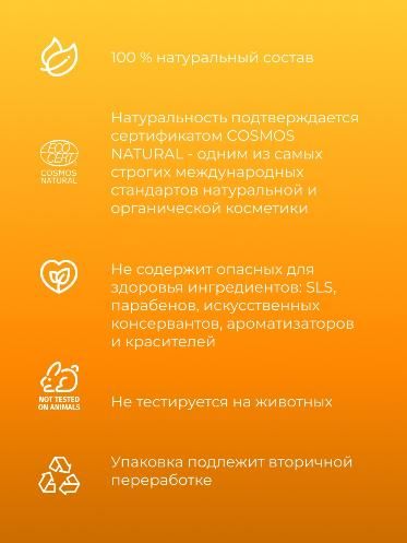 Создано из природных компонентов высокого качества. Не содержит SLS, парабенов, искусственных консервантов, ароматизаторов и красителей.