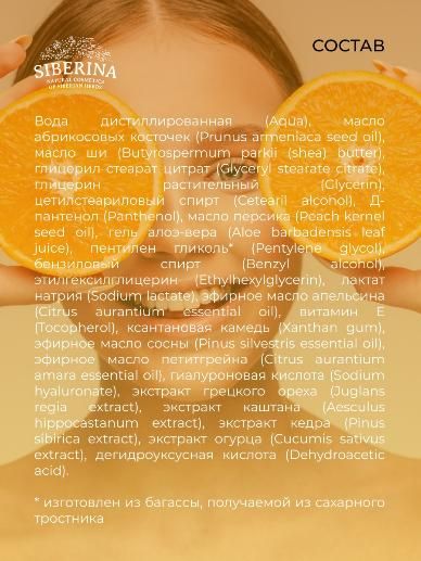 Состав: вода дистиллированная (aqua), масло абрикосовых косточек (prunus armeniaca seed oil), масло ши (butyrospermum parkii (shea) butter), глицерил стеарат цитрат (glyceryl stearate citrate), глицерин (glycerin), цетилстеариловый спирт (cetearil alcohol), д-пантенол (panthenol), масло персика (peach kernel seed oil), гель алоэ-вера (aloe barbadensis leaf juice), пентилен гликоль (pentylene glycol), бензиловый спирт (benzyl alcohol), этилгексилглицерин (ethylhexylglycerin), лактат натрия (sodium lactate), эфирное масло апельсина (citrus aurantium essential oil), витамин е (tocopherol), ксантановая камедь (xanthan gum), эфирное масло сосны (pinus silvestris essential oil), эфирное масло петитгрейна (citrus aurantium amara essential oil), гиалуроновая кислота (sodium hyaluronate), экстракт грецкого ореха (juglans regia extract), экстракт каштана (aesculus hippocastanum extract), экстракт кедра (pinus sibirica extract), экстракт огурца (cucumis sativus extract), дегидроуксусная кислота (dehydroacetic acid)