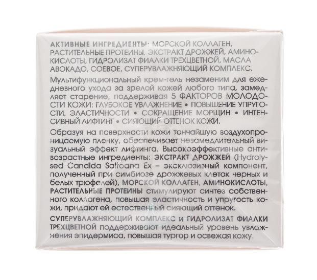 Мультифункциональный крем-гель незаменим для ежедневного ухода за зрелой кожей любого типа, замедляет старение, поддерживая 5 Факторов Молодости Кожи. Образуя на поверхности кожи тончайшую воздухопроницаемую пленку, обеспечивает незамедлительный визуальный эффект лифтинга.