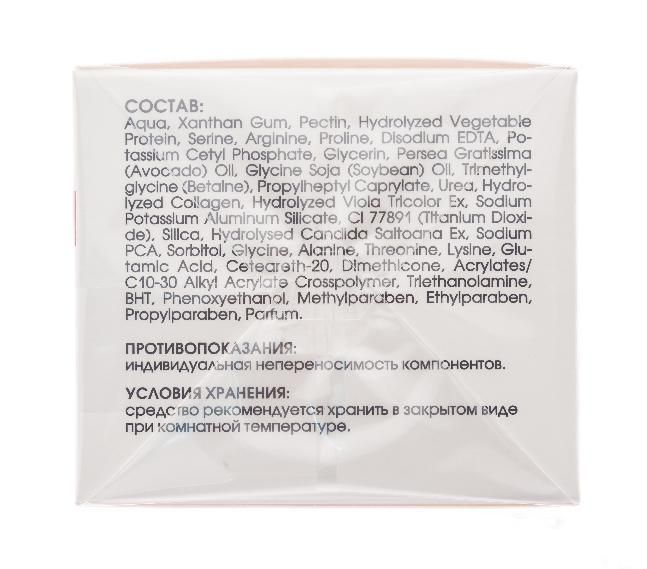 Морской коллаген, растительные протеины, экстракт дрожжей, аминокислоты, фиалка трехцветная, масла авокадо, соевое, суперувлажняющий комплекс.