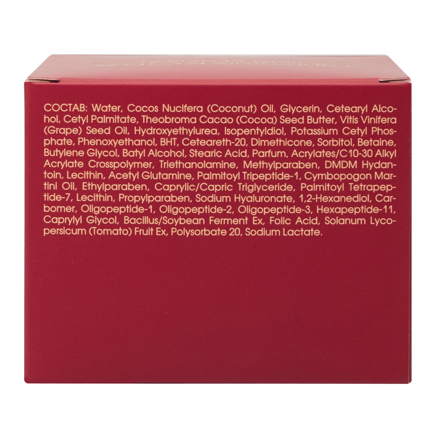 Состав: water, cocos nucifera (coconut) oil, glycerin, cetearyl alcohol, cetyl palmitate, theobroma cacao (cocoa) seed butter, vitis vinifera (grape) seed oil, hydroxyethylurea, isopentyldiol, potassium cetyl phosphate, phenoxyethanol, bht, ceteareth-20, dimethicone, sorbitol, betaine, butylene glycol, batyl alcohol, stearic acid, parfum, acrylates/c10-30 alkyl acrylate crosspolymer, triethanolamine, methylparaben, dmdm hydantoin, lecithin, acetyl glutamine, palmitoyl tripeptide-1, cymbopogon martini oil, ethylparaben, caprylic/capric triglyceride, palmitoyl tetrapeptide-7, lecithin, propylparaben, sodium hyaluronate, 1,2-hexanediol, carbomer, oligopeptide-1, oligopeptide-2, oligopeptide-3, hexapeptide-11, caprylyl glycol, bacillus/soybean ferment extract, folic acid, solanum lycopersicum (tomato) fruit extract, polysorbate 20, sodium lactate.