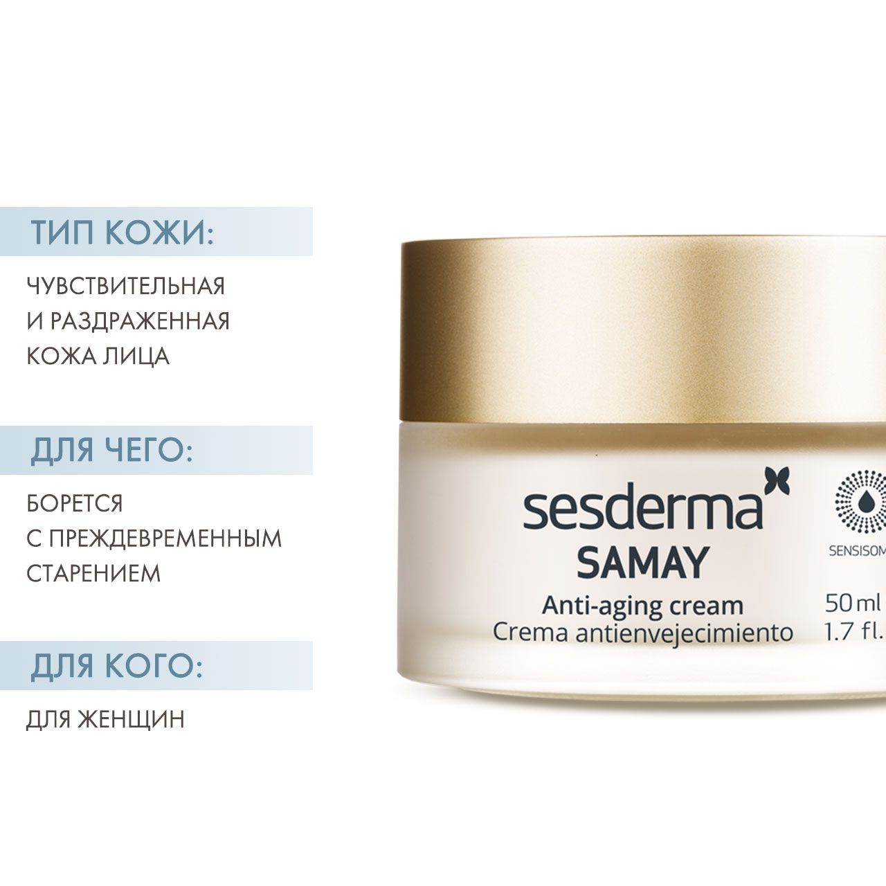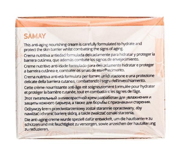 Крем антивозрастной Samay специально разработан для чувствительной и кожи склонной к раздражению. В дополнение к омолаживающему действию активные вещества восстанавливают защитный барьер, питают, увлажняют кожу и оказывают успокаивающее действие.