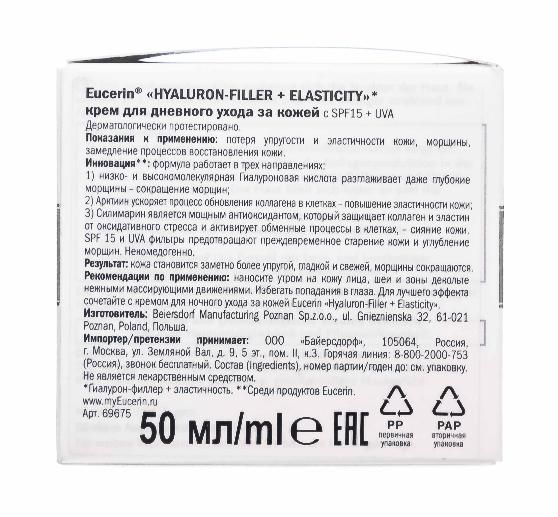Наносите утром на кожу лица, шеи и зоны декольте нежными массирующими движениями. Для лучшего эффекта сочетайте с кремом для ночного ухода за кожей Eucerin HYALURON-FILLER + ELASTICITY.