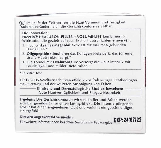 Этот дневной крем содержит три активных ингредиента, действие которых направлено на определенные слои кожи, в которых происходит потеря объема: магнолол увеличивает размер и количество создающих объем клеток1, олигопептиды способствуют выработке коллагена, делающего кожу более упругой, а гиалуроновая кислота интенсивно увлажняет кожу и разглаживает глубокие морщины. При регулярном использовании крема для дневного ухода за сухой кожей Eucerin HYALURON-FILLER + VOLUME-LIFT восстанавливается потерянный объем и контуры лица становятся более четкими. Мелкие и глубокие морщины заметно сокращаются, кожа становится намного более гладкой и упругой.